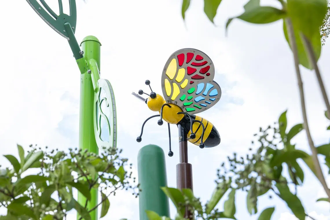 The playscape at the promenade near the upcoming Punggol Regional Sports Centre (RSC) comes alive through kinetic elements that engage the senses, featuring outsized and stylised bees, dragonflies and butterflies.