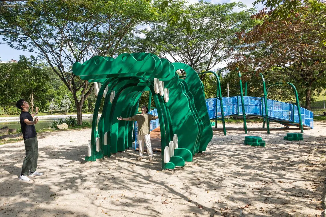 The Wow, A Crocodile! installation has a wavy body that reflects the flow of Punggol Waterway.