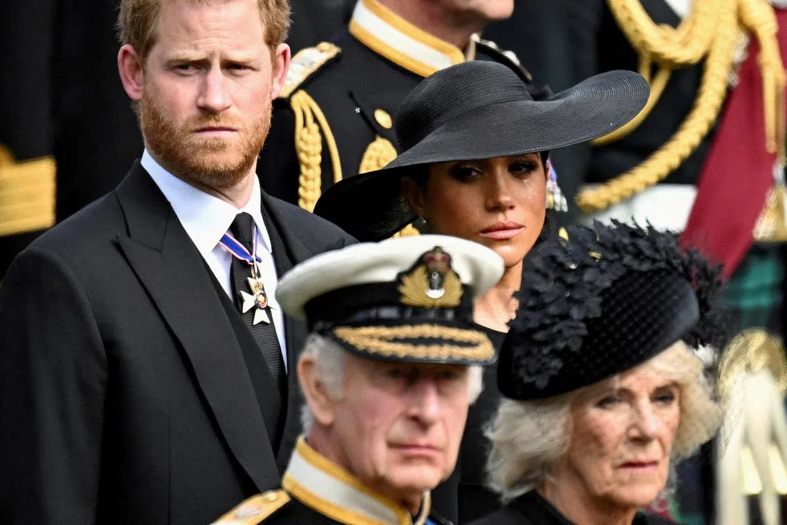 Prince Harry and wife Meghan attend the funeral of Britain’s Queen Elizabeth II in September last year, with with his father, King Charles, and Camilla, Queen Consort.