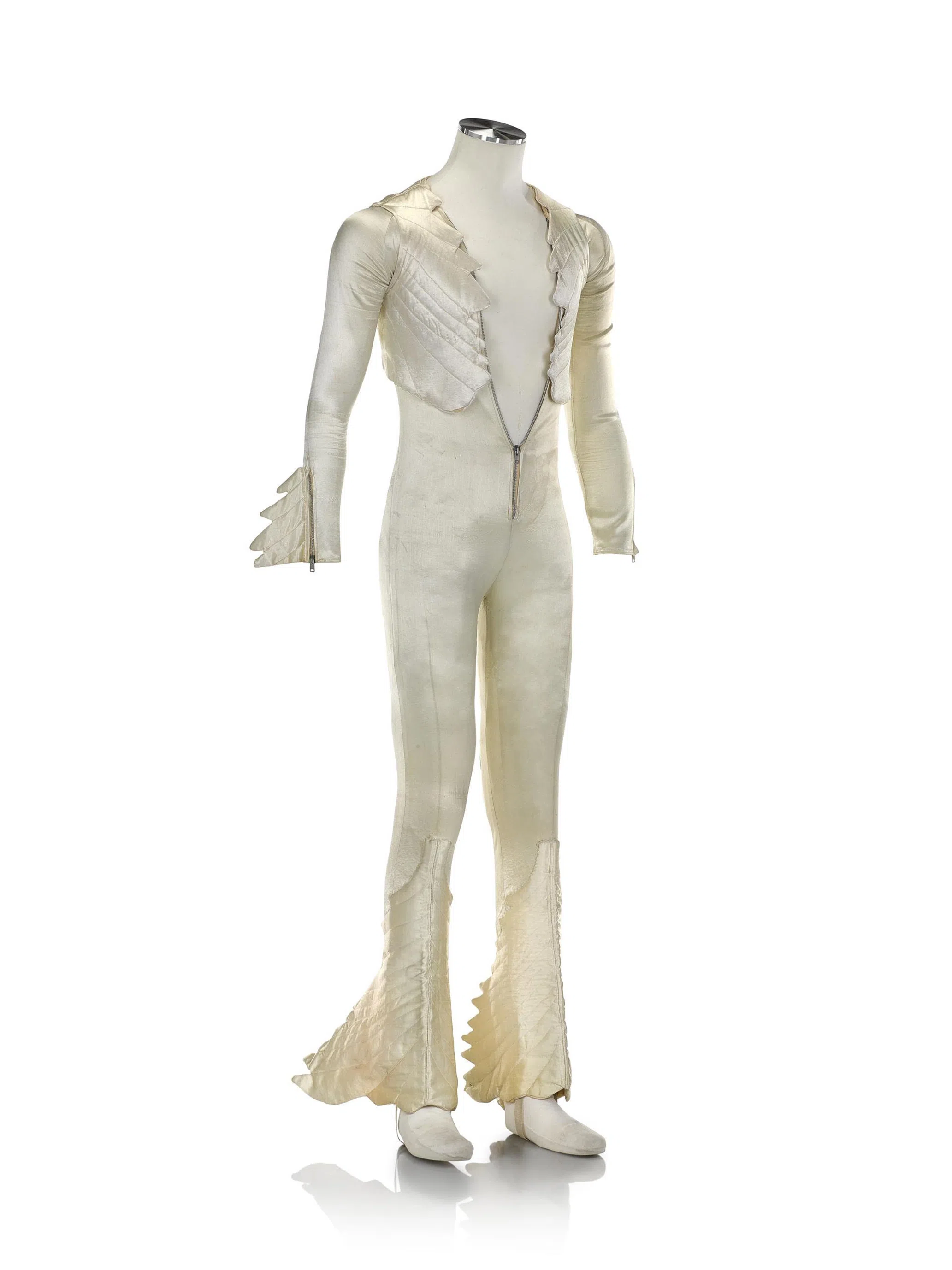 For the promotional video of Queen’s Bohemian Rhapsody, Mercury commissioned his friend – designer Wendy de Smet – to create a two-piece stage outfit comprising a catsuit and bolero of ivory satin with winged wrists and lower legs (estimated price of between £50,000 and £70,000).