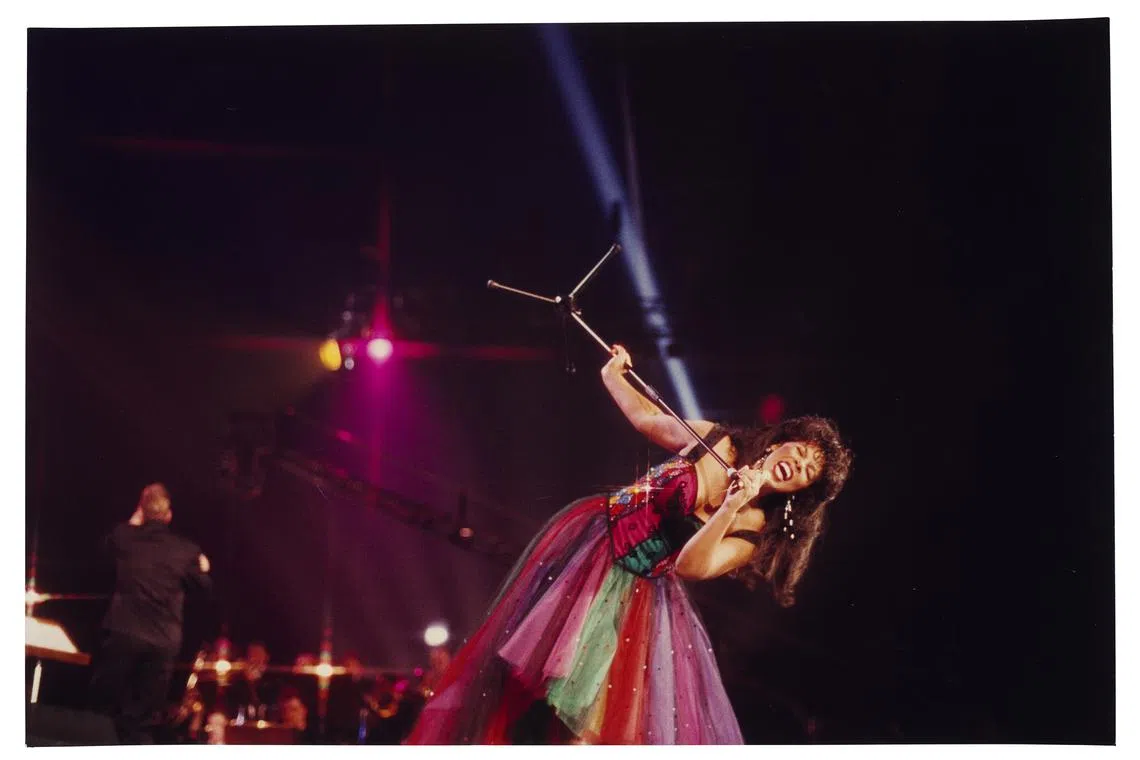 A photograph of Donna Summer on stage (circa 1995) that is up for auction by Christie’s. She is wearing a multi-coloured silk and tulle evening dress with a rhinestone bodice that is also for sale by Christie’s.
