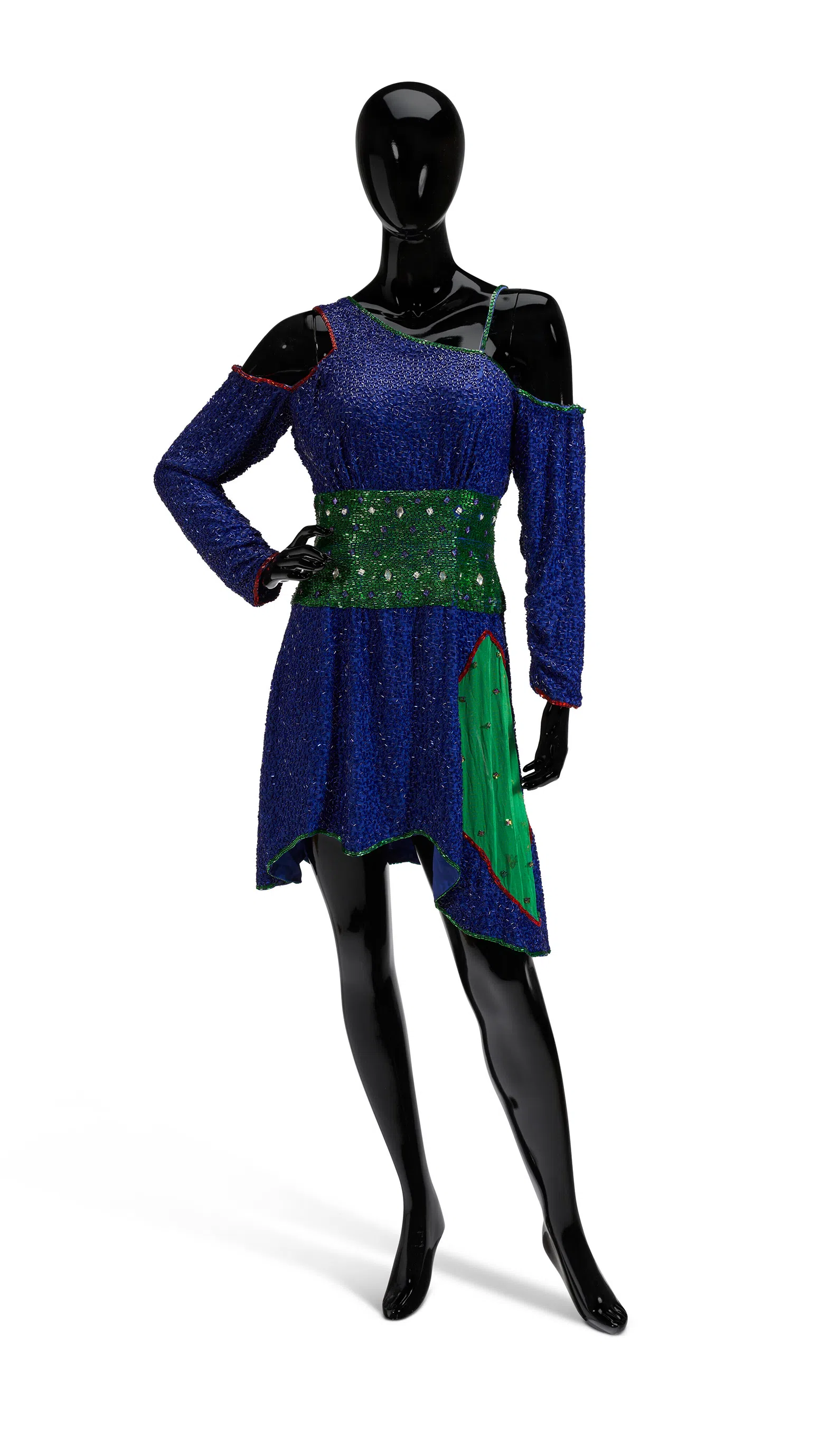 Donna Summer’s blue, green and red silk and tulle dress worn in the video for the 1983 single Unconditional Love for auction at Christie’s.