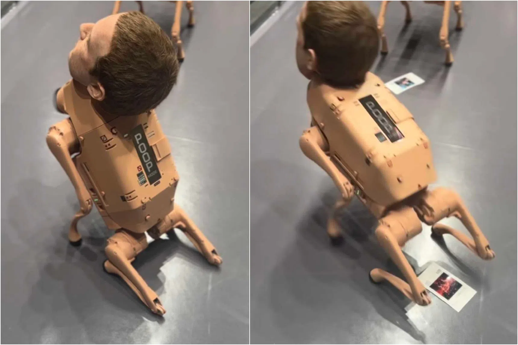 The robots tipped backwards and ejected small images resembling polaroid photographs from their hindquarters accompanied by the words “poop mode” on their backs.