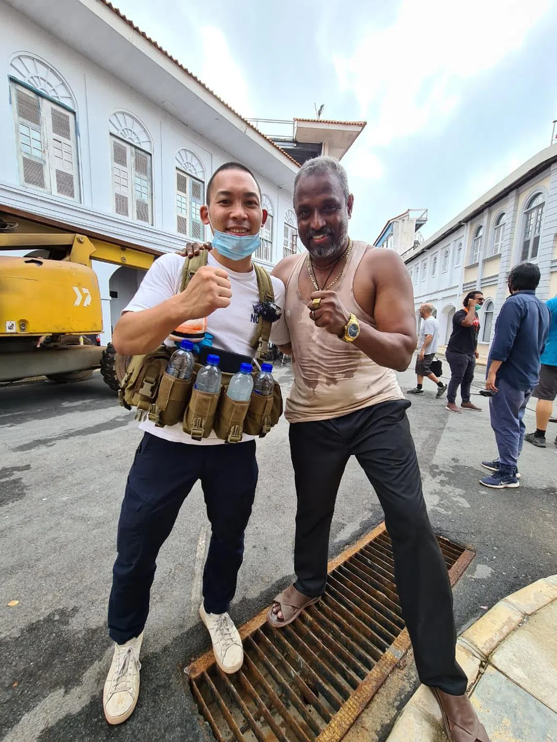 Mathialagan in a behind-the-scenes photo on the set of Monkey Man with a Singaporean crew member, who was helping to keep the actor hydrated.
