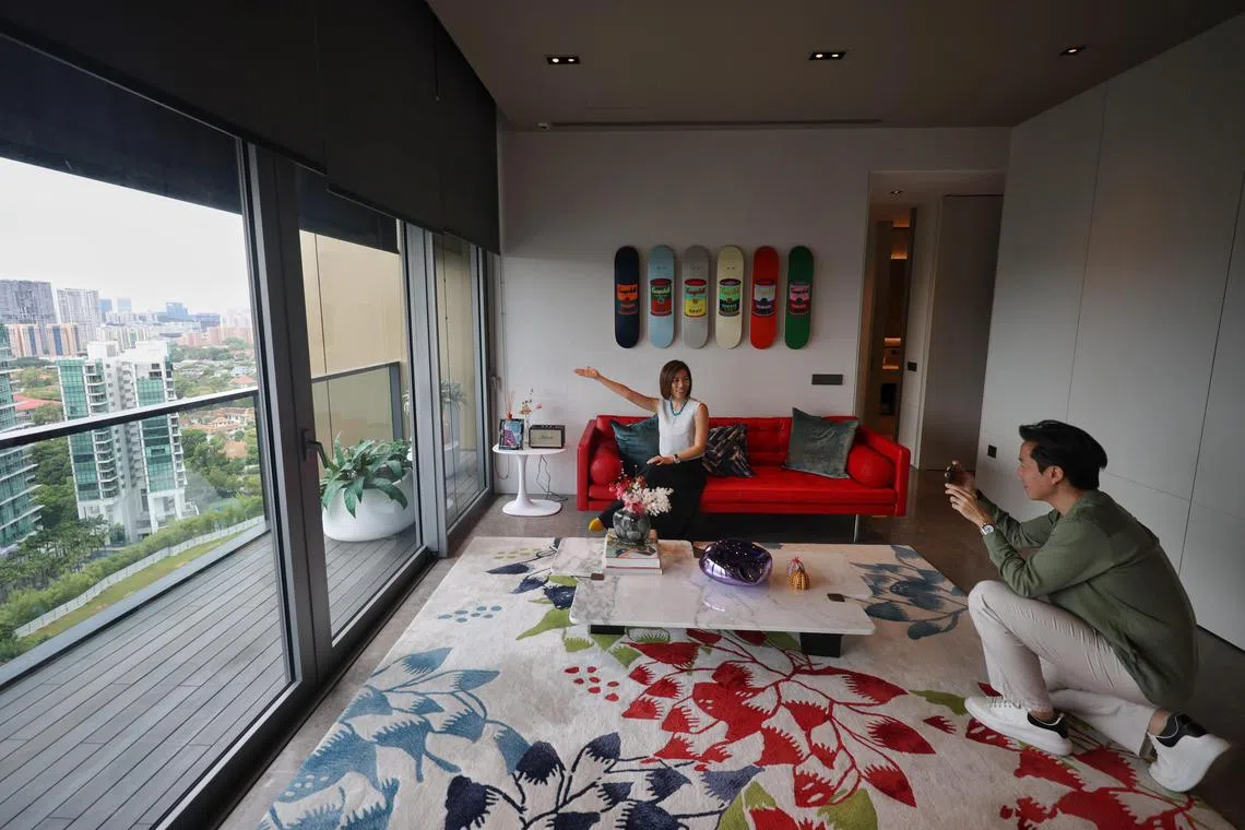 Ms Joelle Chew and Mr Shen Jiaming creating social media footage for a Cuscaden Reserve condominium unit, which has an asking price of $3,391 per sq ft.