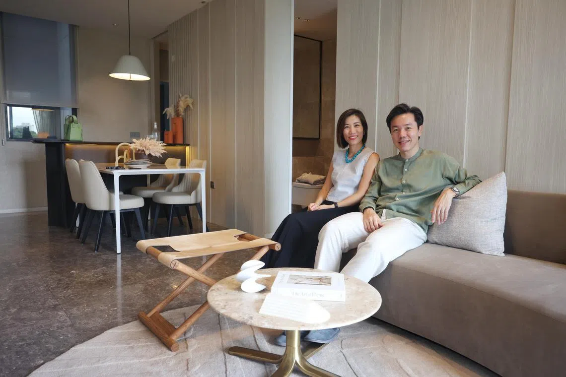 Husband-and-wife real estate agent team Joelle Chew and Shen Jiaming showing a for-sale Nassim Hill condominium, which has an asking price of $3,509 per sq ft.