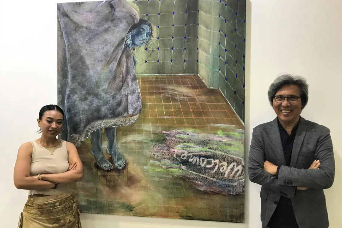 Mr Albert Lim (right) and artist Aisha Rosli in front of her painting, Can’t Stop Wondering Where You Are, which he bought from Cuturi Gallery at Art SG.