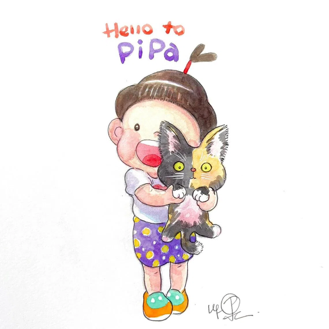 PiPa, the four-month-old tricolour cat with a distinctive half-black, half-brown face, is a new character in the artist's illustrations.