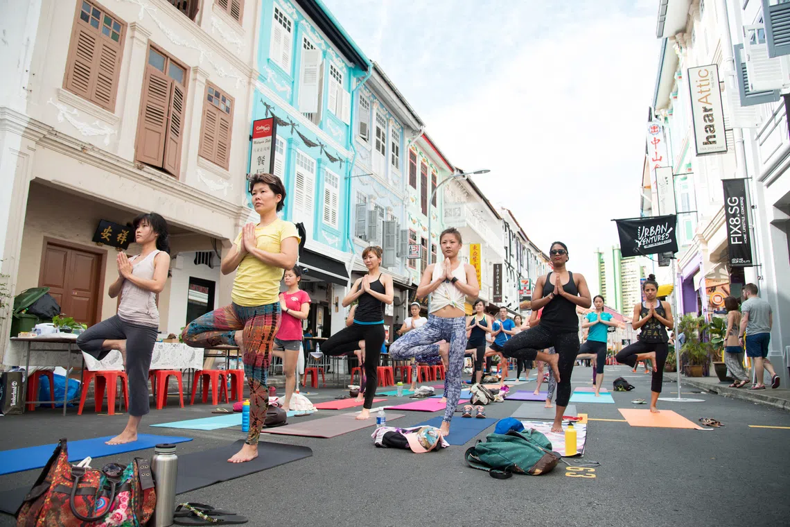 People doing yoga in Keong Saik Road during Urban Ventures’ 2016 edition.