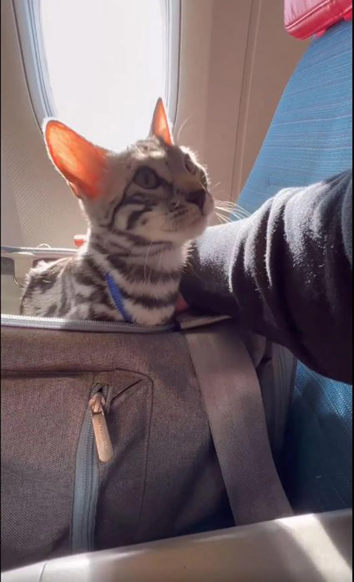 Metis had to be in a pet carrier on board the flight, but, occasionally, Mr Choo would open the carrier to check on her.
