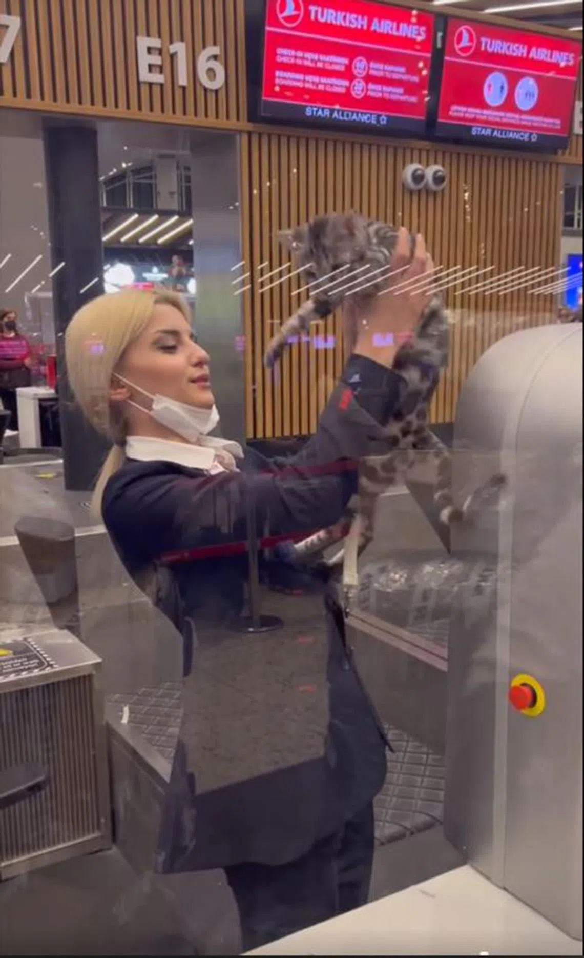 Turkish Airlines counter staff greeting Metis, Mr Andrew Choo’s Silver Charcoal Bengal cat, at Istanbul Airport.