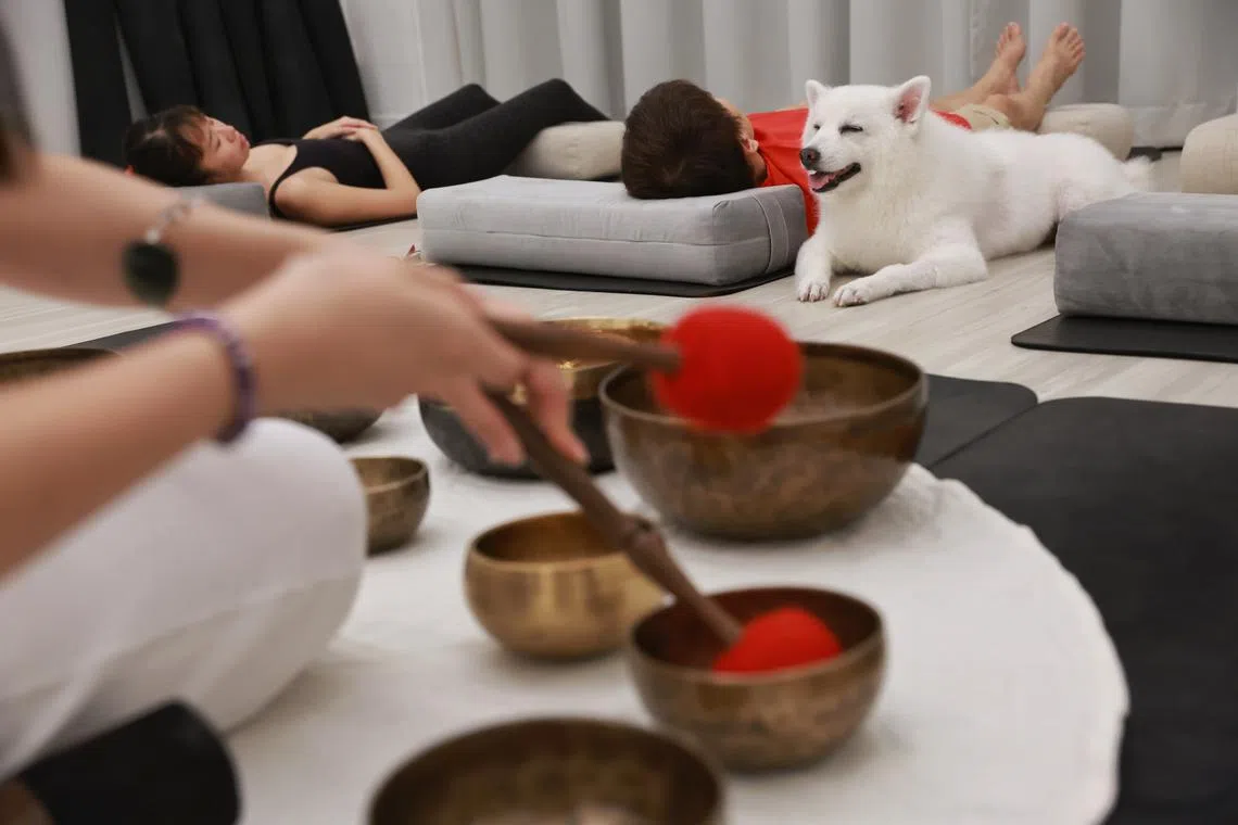 All the dog and pet owner have to do is lie on mats on the floor together, relax and let the sounds made from reverberating bowls wash over them. It costs $300 for a private one-hour session.