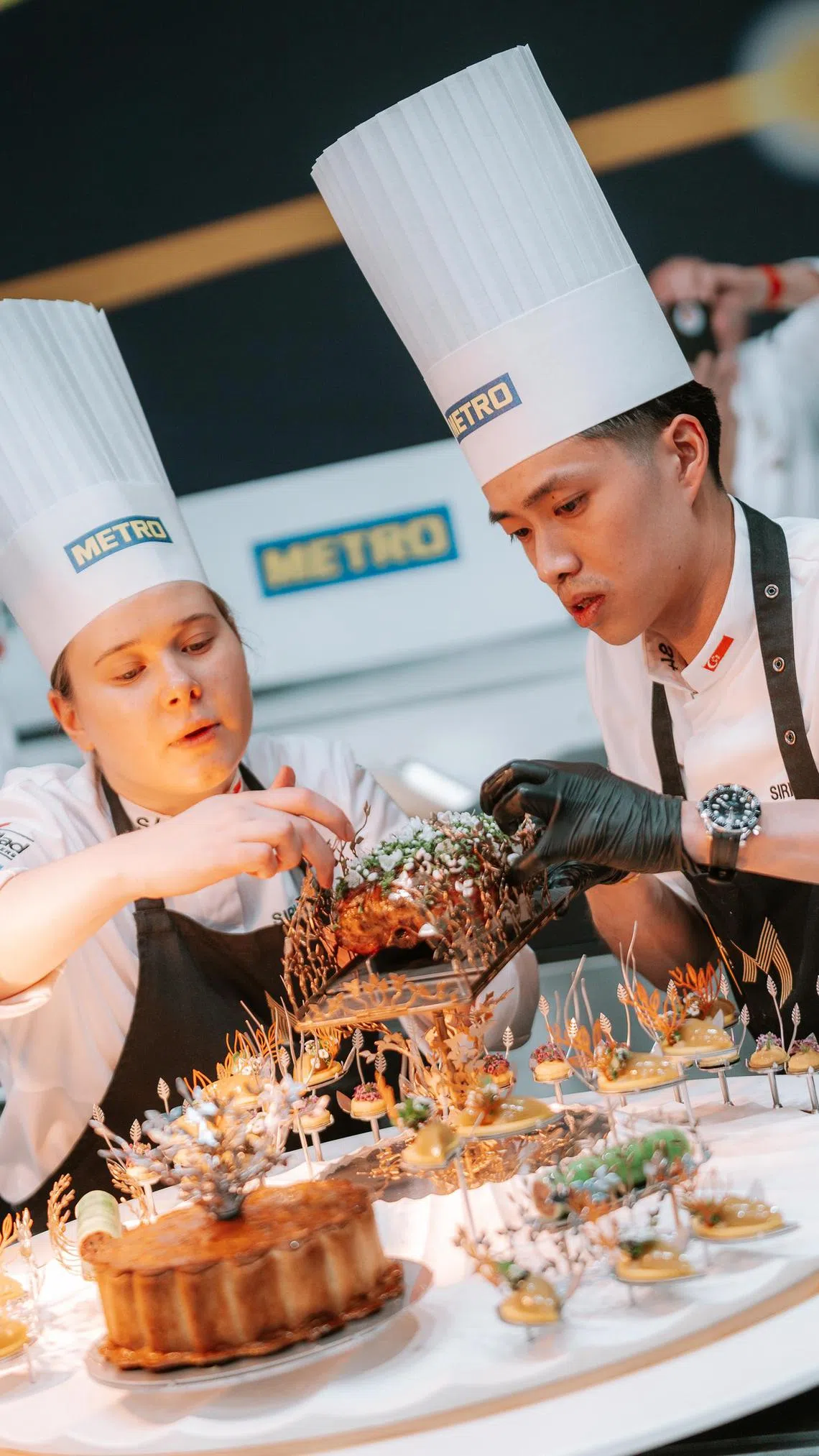 Chef Mathew Leong (right) putting the finishing touches on his platter with the help of his commis, Synva Knapstad Gjerde, at the Bocuse d’Or finale in Lyon, France.
