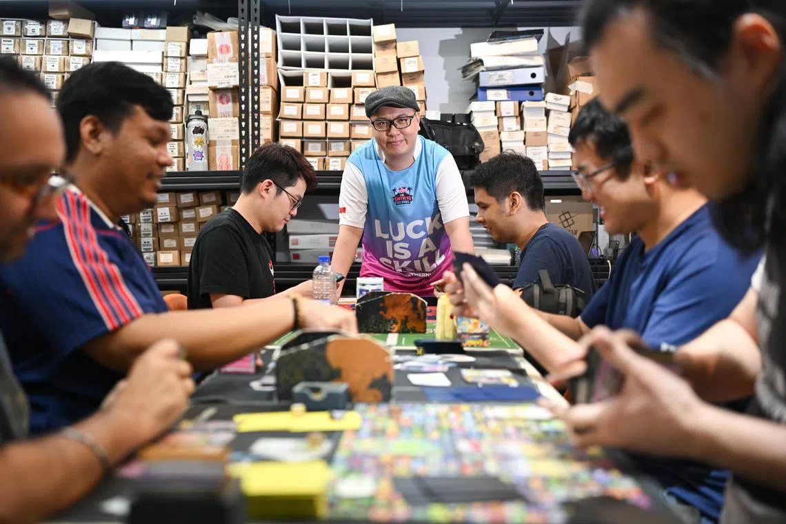 Mr Thomas Xu, owner of Goodness Gracious Games, watches as customers play the Pokemon card game during a weekly tournament.