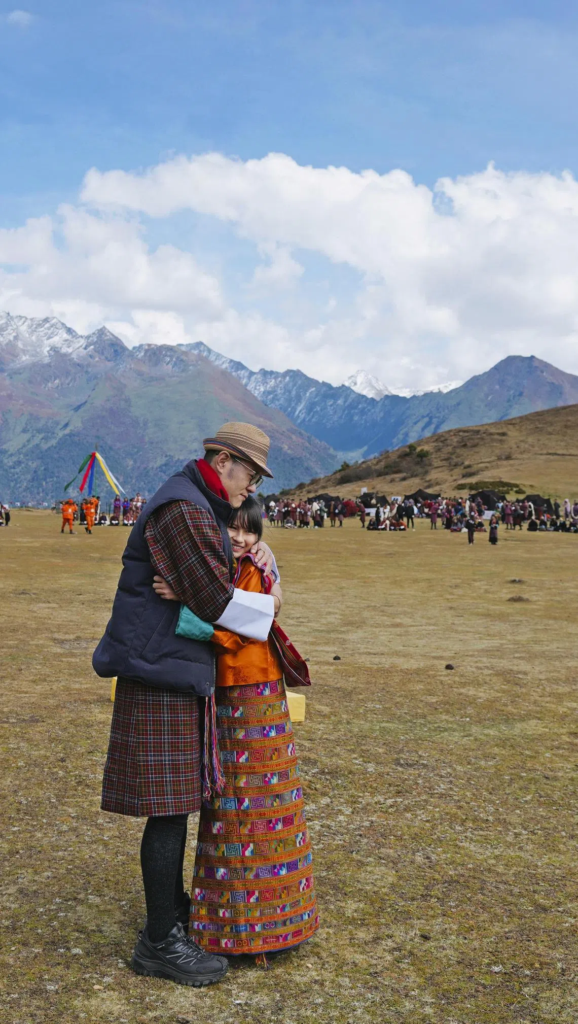 King Jigme Khesar Namgyel Wangchuck of Bhutan (left) giving Hillary O’Sullivan a hug after her piano performance at the Royal Highland Festival in Laya, Bhutan, in 2023.