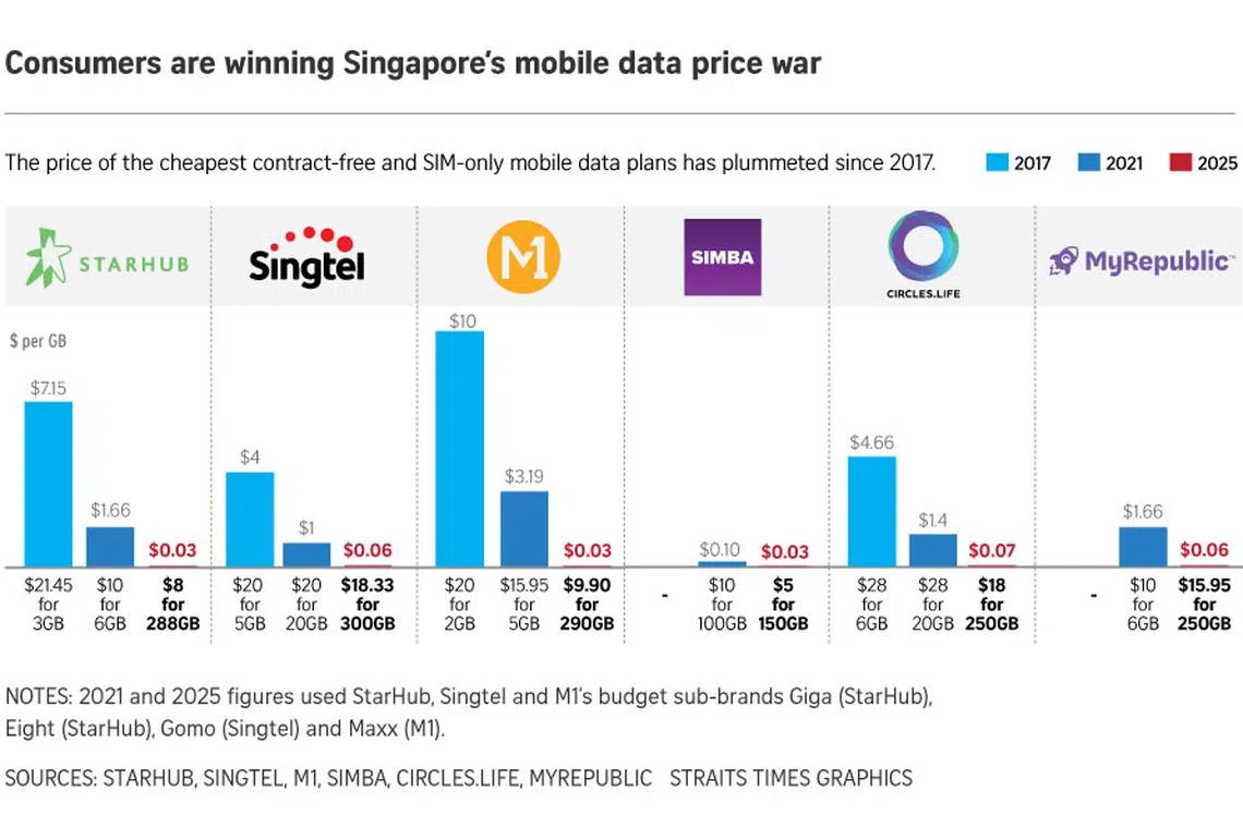 Those days are long gone in Singapore, where a fierce price war has changed the price of each gigabyte (GB) from dollars to cents since the mid-2010s – a drop so dramatic that some consumers now use mobile data instead of traditional home broadband.