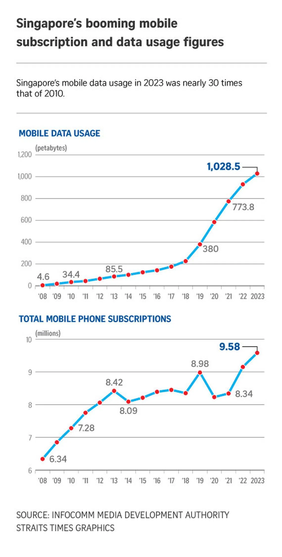 There were 9,960,700 mobile subscriptions in Singapore at the end of 2024 – which translates to a 165 per cent mobile penetration rate, according to IMDA data.