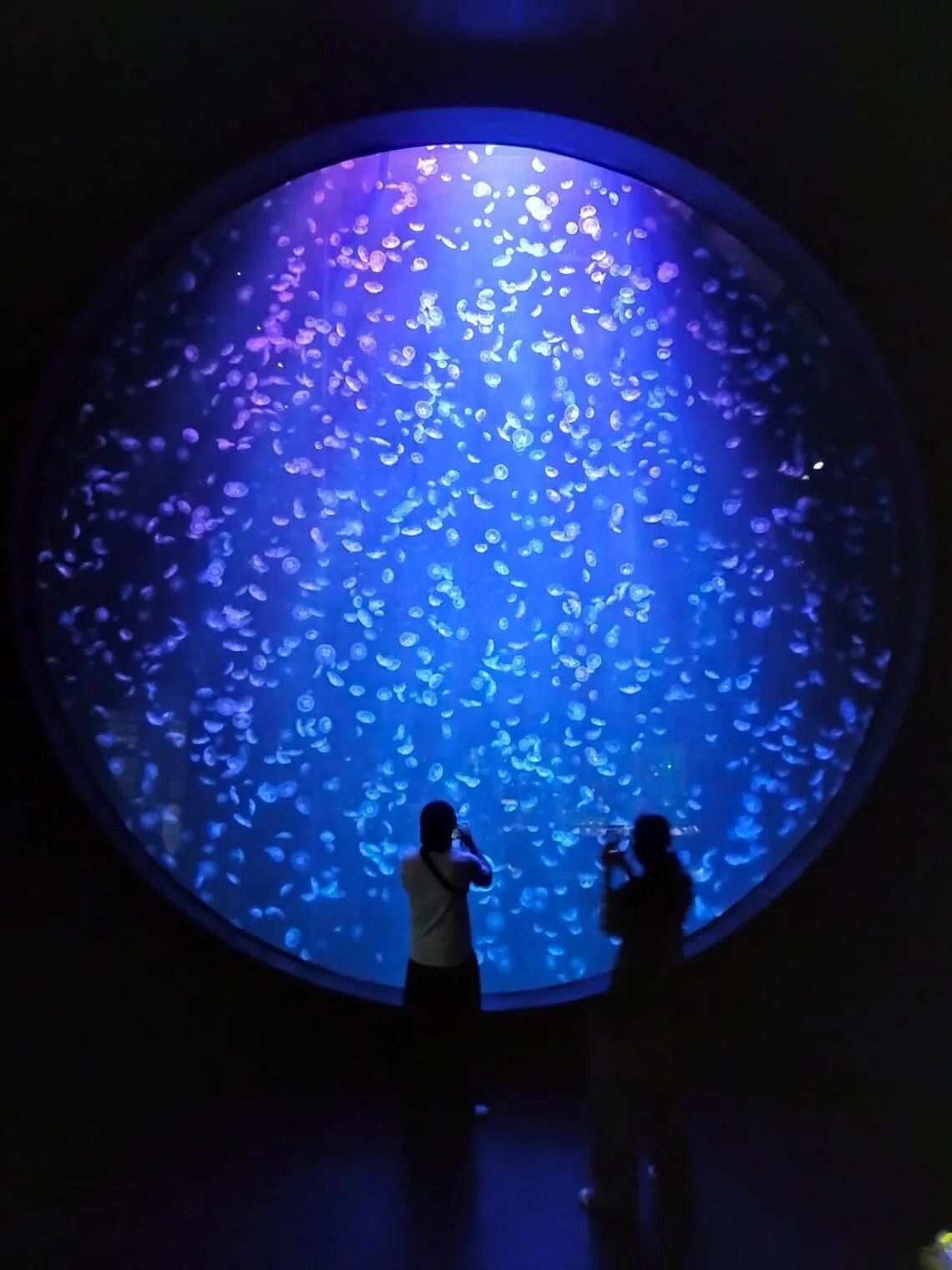 A massive circular tank filled with thousands of moon jellies that drift and glow in a mesmerising display.