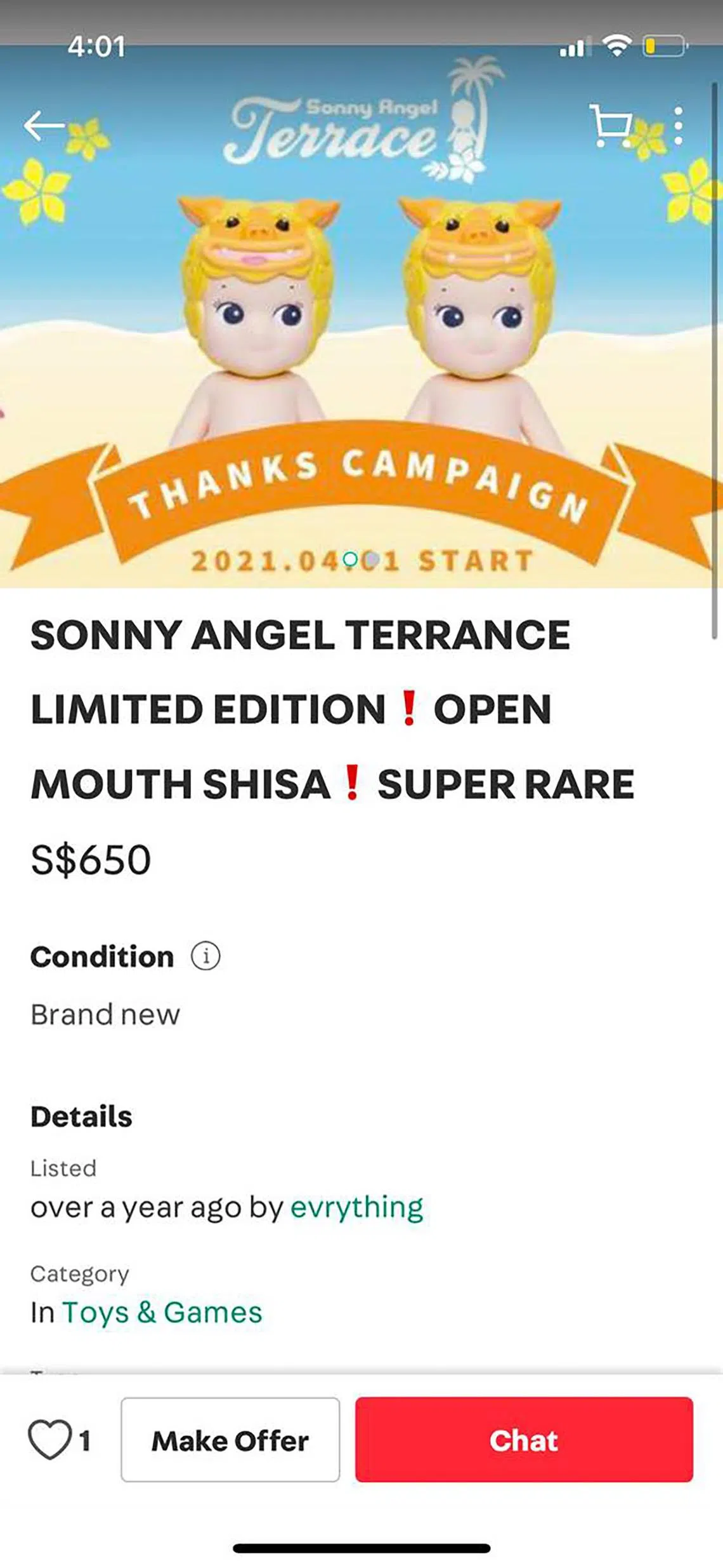 A rare Shisa Sonny Angel listed on Carousell for $650.
