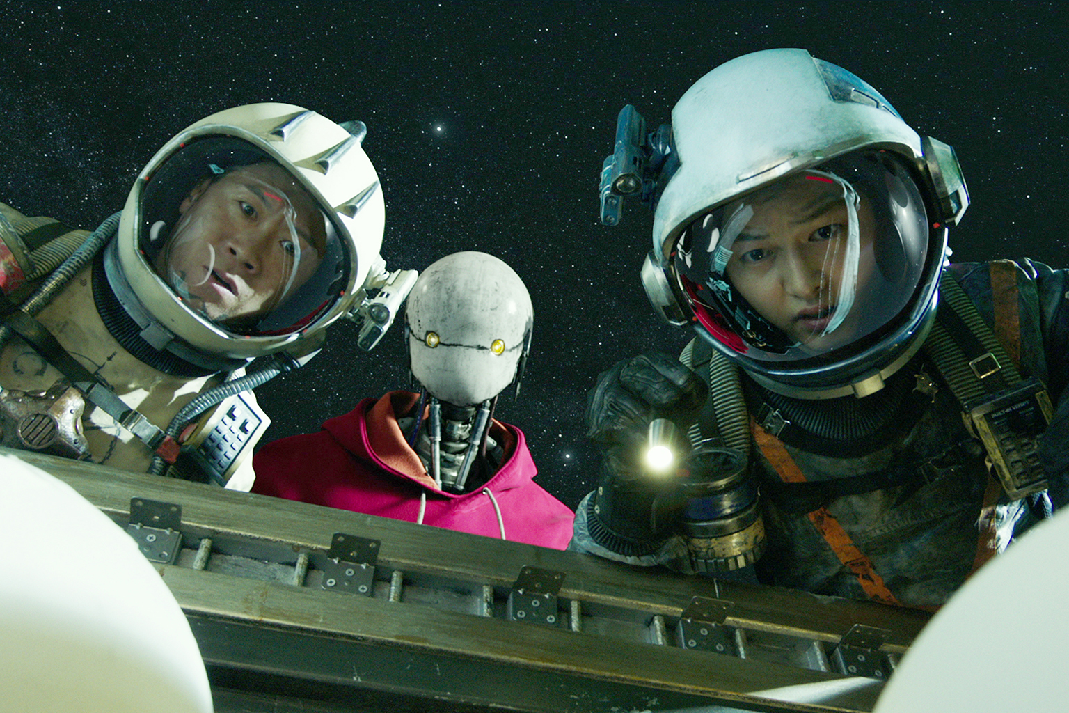 Space Sweepers stars Jin Seon-kyu (left), Song Joong-ki (right) and Yoo Hai-jin, who plays a robot character.