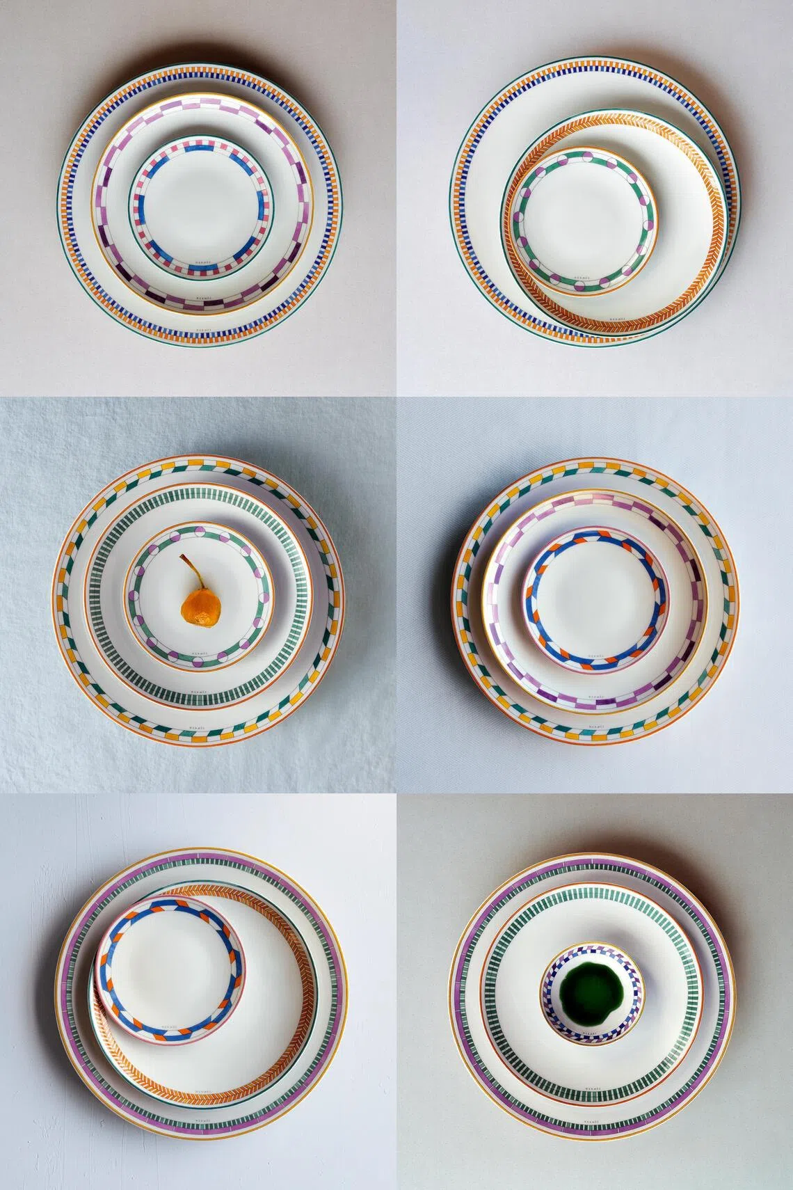 French luxury design house Hermes has collaborated with Irish artist Nigel Peake on a line of tableware built around coloured geometric borders that riff on musical rhythm.