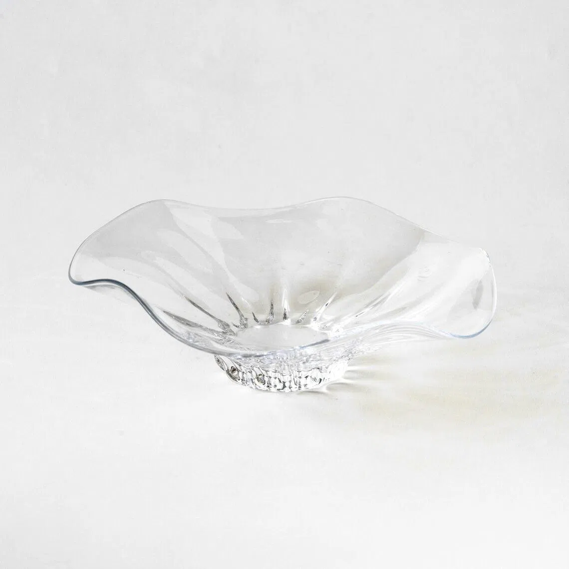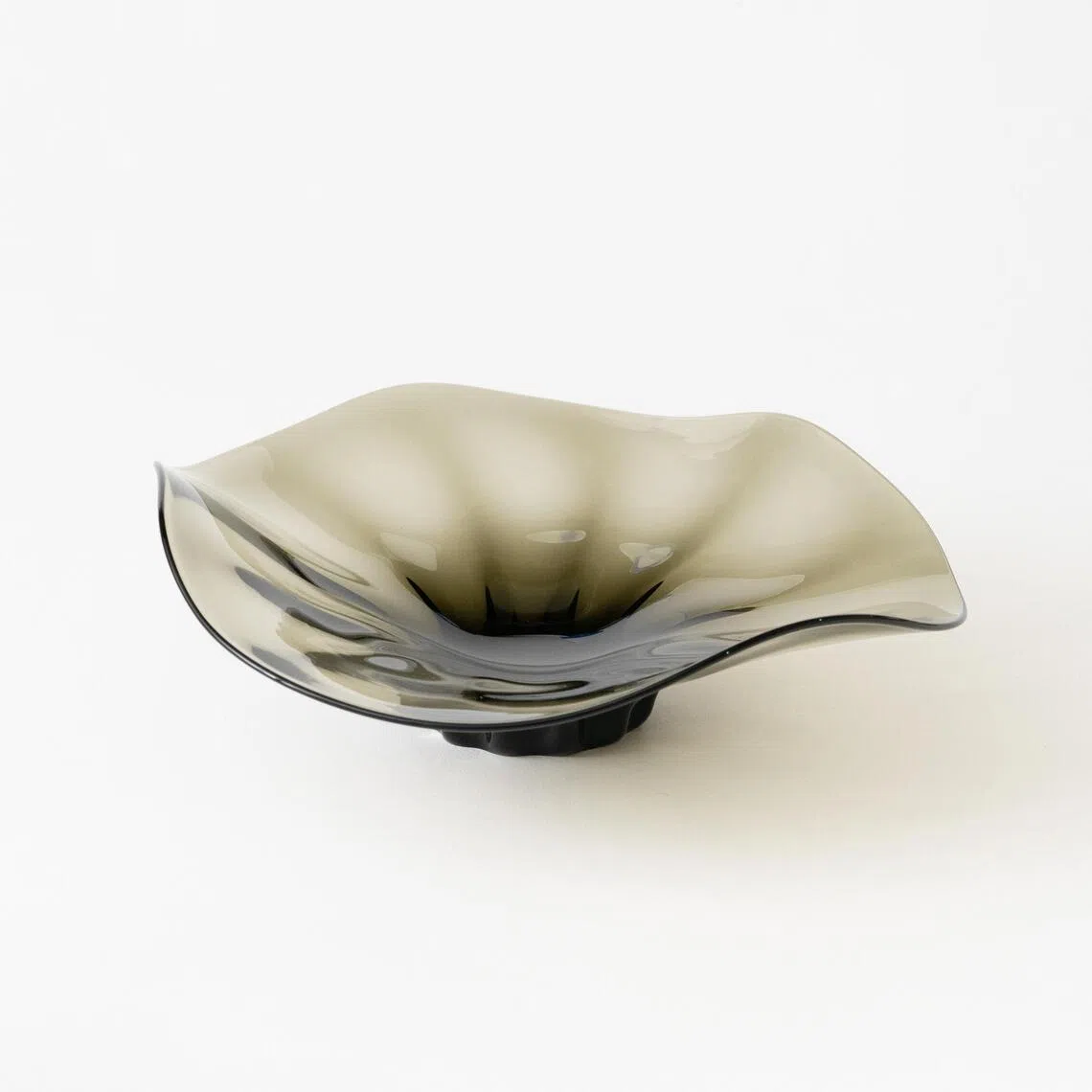The Flutter Plate sits in that tradition. Its light, fluttering form is created using steam to expand molten glass, which is then opened up by centrifugal force and left for gravity to decide its final curve.