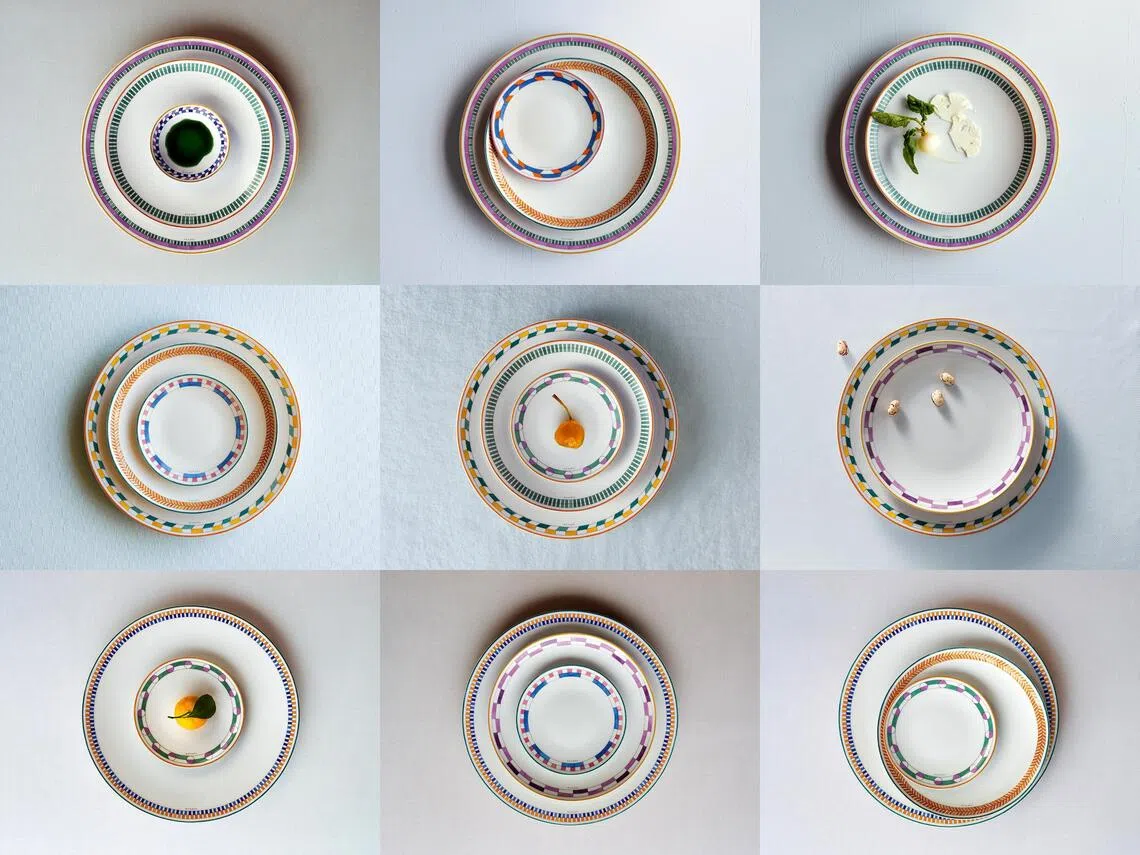 Borders collide with or echo one another – pink is paired with green, and yellow contrasts with blue. This allows the host to “compose” a new arrangement each time, like shuffling notes in a score rather than laying out a rigid, matching set for the table.