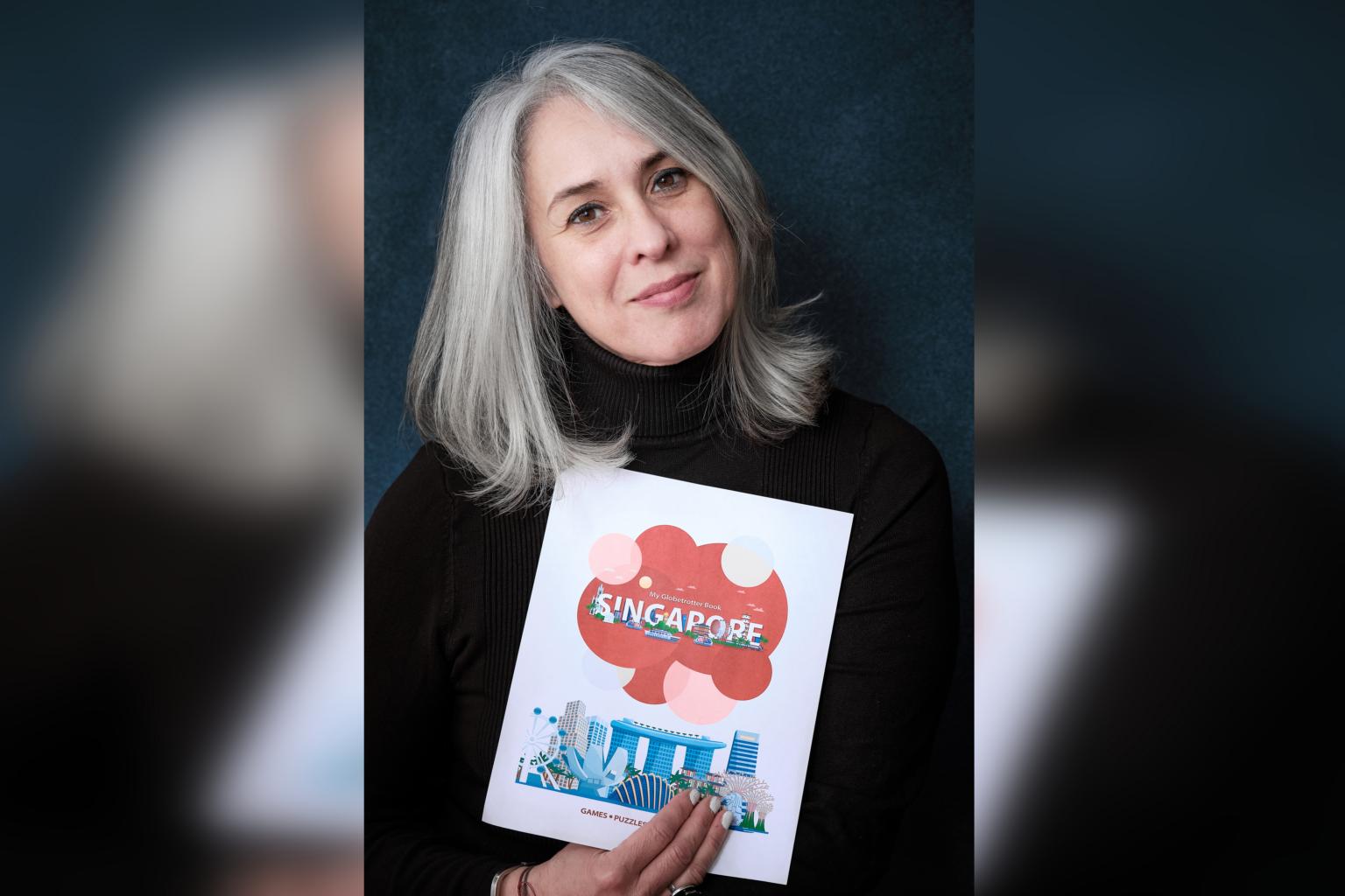 Author Marisha Wojciechowska with her children's activity book, My Globetrotter Book: Singapore.