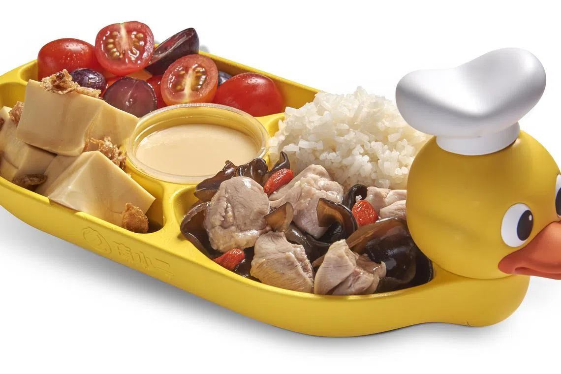The new kids’ sets at Dian Xiao Er restaurant chain include mains such as steamed chicken with black fungus, and are served on a yellow silicone rubber ducky plate.