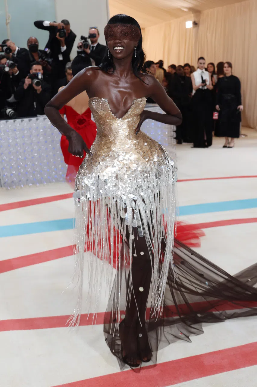 American model Anok Yai arriving on the red carpet for the 2023 Met Gala, in New York, on May 1, 2023.