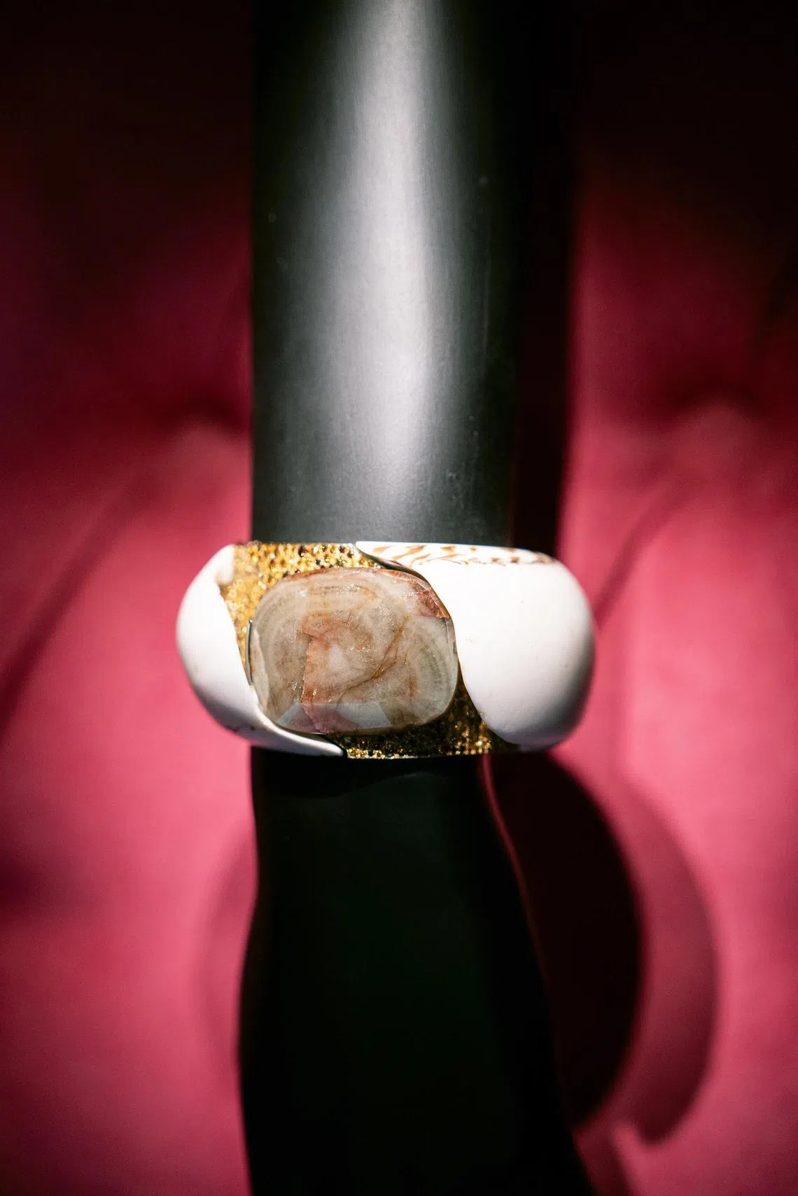 The 60-year-old founder of jewellery brand Etcetera has on display a bangle fashioned from a pair of antique shell bracelets originally worn by the Dayak people of Borneo. He cut the bracelets in half and reassembled them to hold in place a 100-carat industrial diamond with a wood-grain pattern.