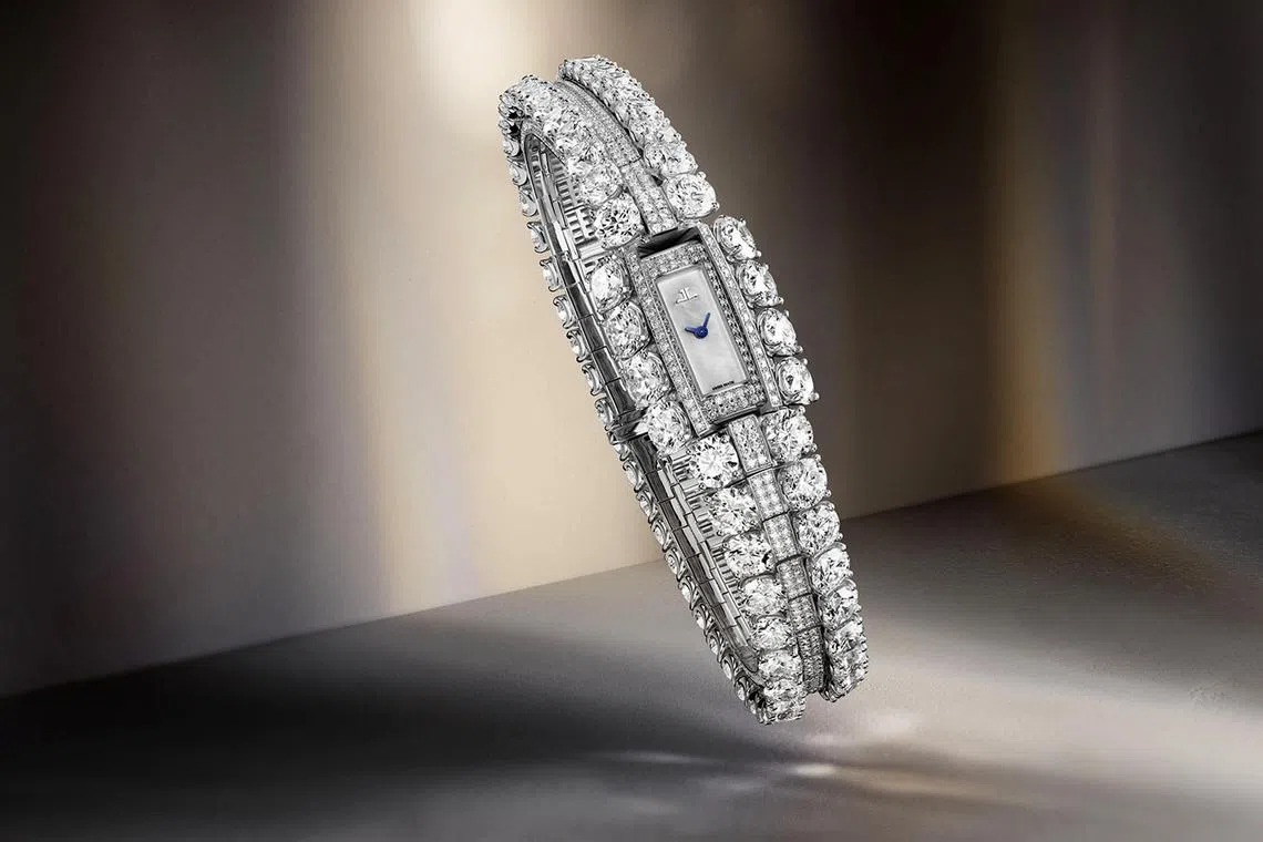 Shimmering with 1,028 diamonds, the bracelet is crafted to enhance the brilliance of the platinum setting. Jaeger-LeCoultre’s artisans devoted 182 hours to gem-setting, using techniques that ensure each diamond is placed perfectly.