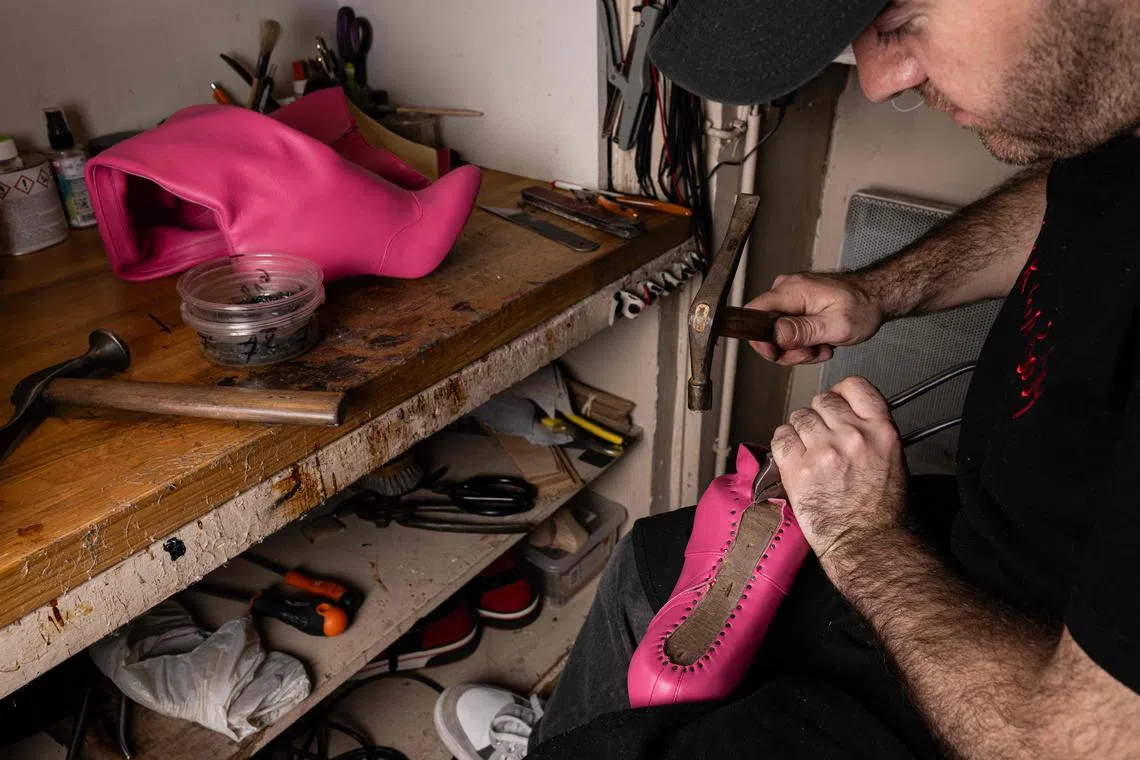 A bootmaker works on footwear for Moulin Rouge dancers at the Clairvoy atelier in Paris.