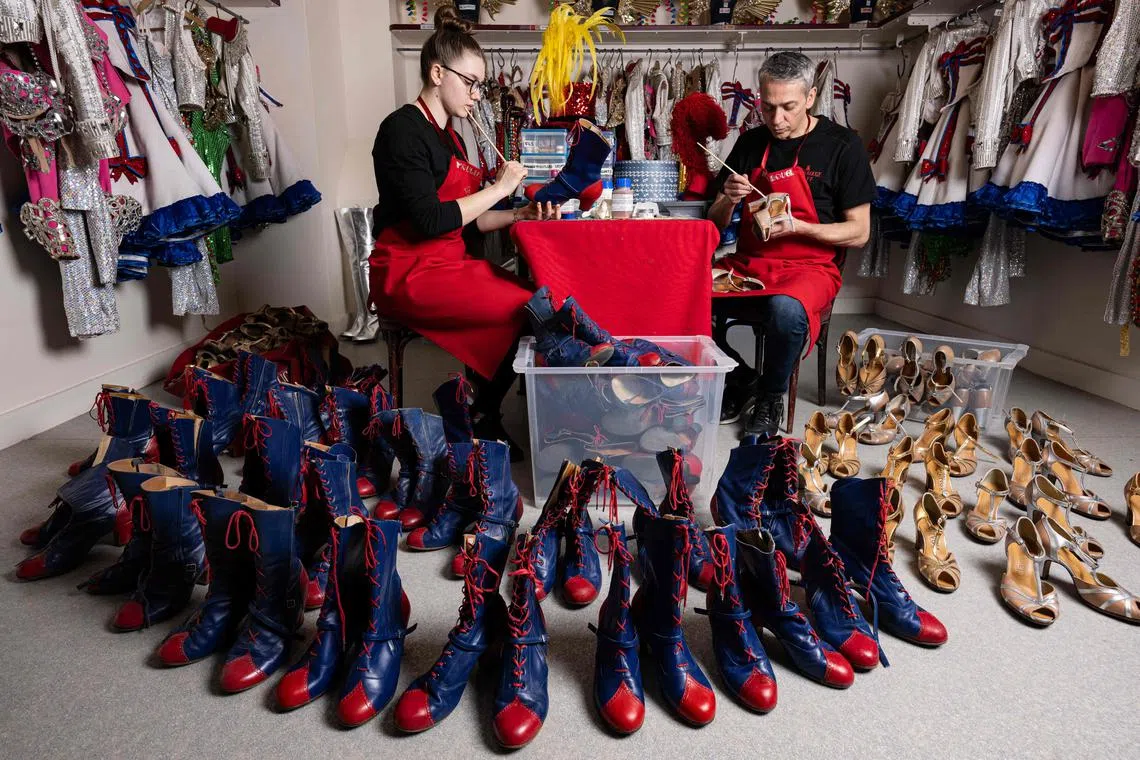 Staff working on maintaining the footwear of the Moulin Rouge dancers.