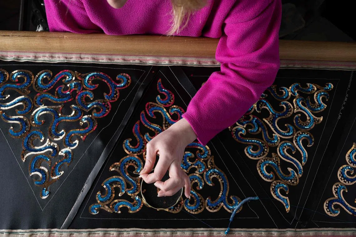 An apprentice at Atelier Valentin, which is in charge of the embroidery work on the costumes, doing threadwork at the atelier in Paris.