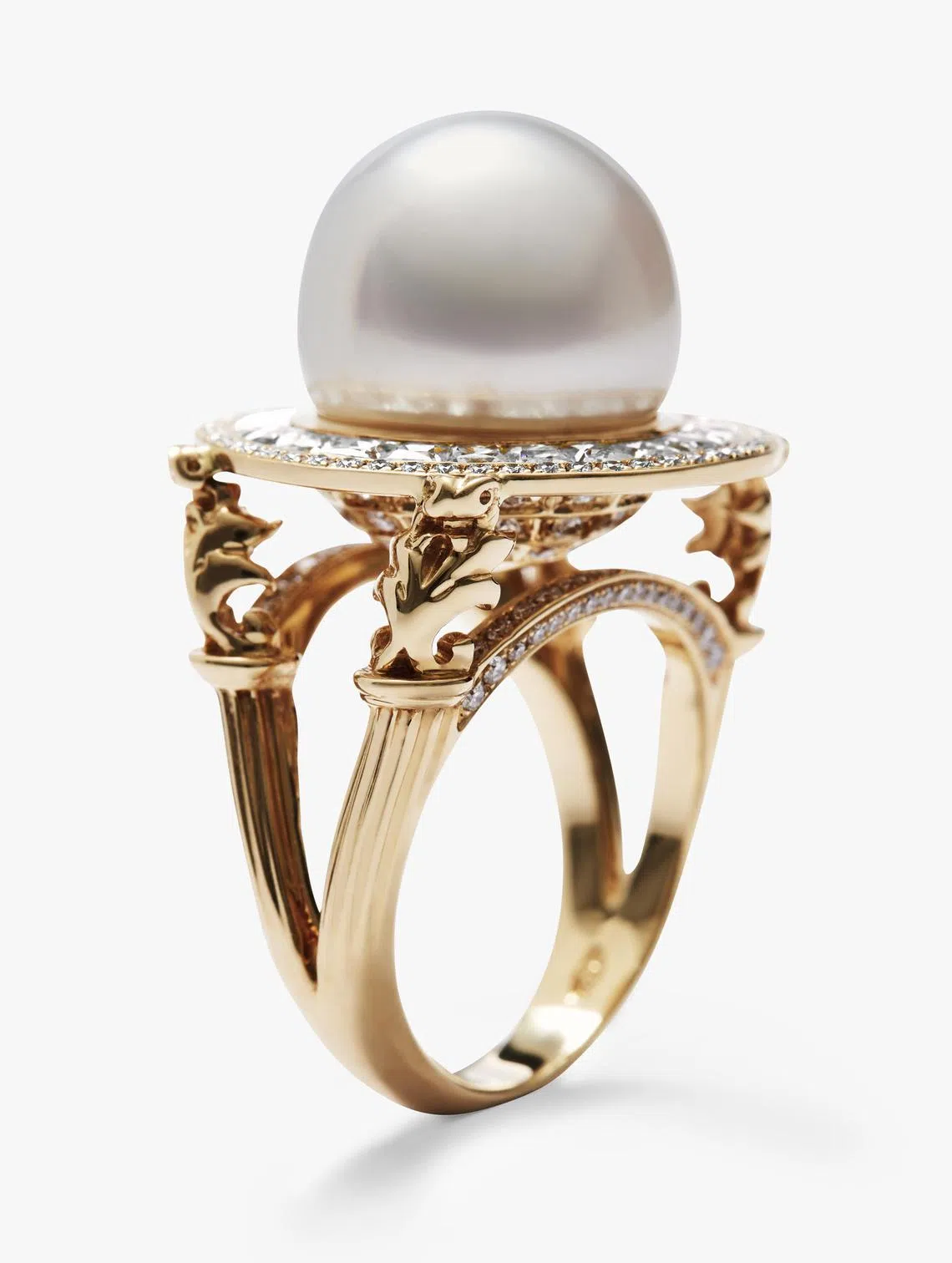 This ring from its Mediterranean Collection is topped with a 14mm South Sea pearl and flanked with white sapphires and diamonds.