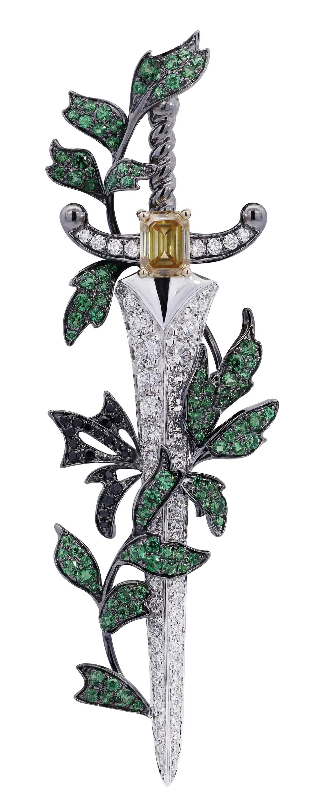 Home-grown jeweller to the stars, Simone Jewels has dressed the likes of pop icons including Rihanna and Taylor Swift. This transformable piece of jewellery, which can be worn as a pendant or brooch, features tsavorite garnet, fancy yellow diamond and black spinel set in 18K white and black gold.