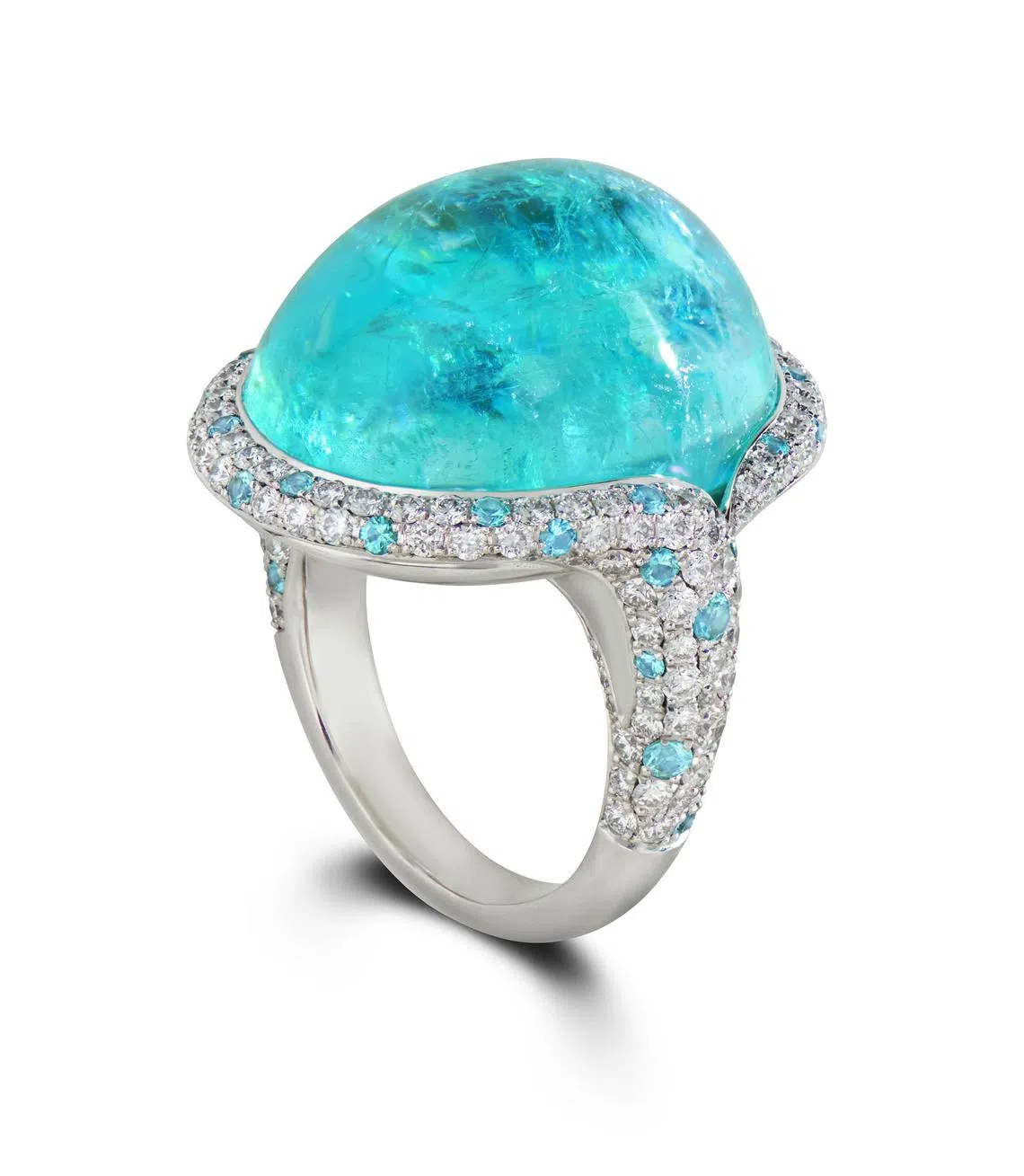 Using the vivid blue stones from Paraiba, Brazil, she produces one-of-a-kind jewellery handmade in the heart of Switzerland. This diamond and Paraiba tourmaline ring is crowned with a rare 37.84-carat Paraiba tourmaline.