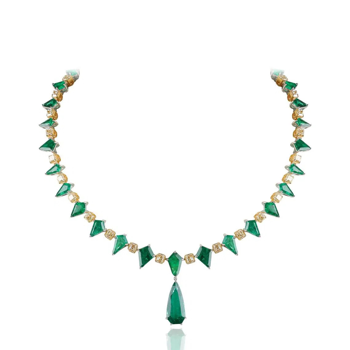 This necklace features 40.26 carats of Zambian emeralds with 18.49 carats of fancy yellow diamonds.
