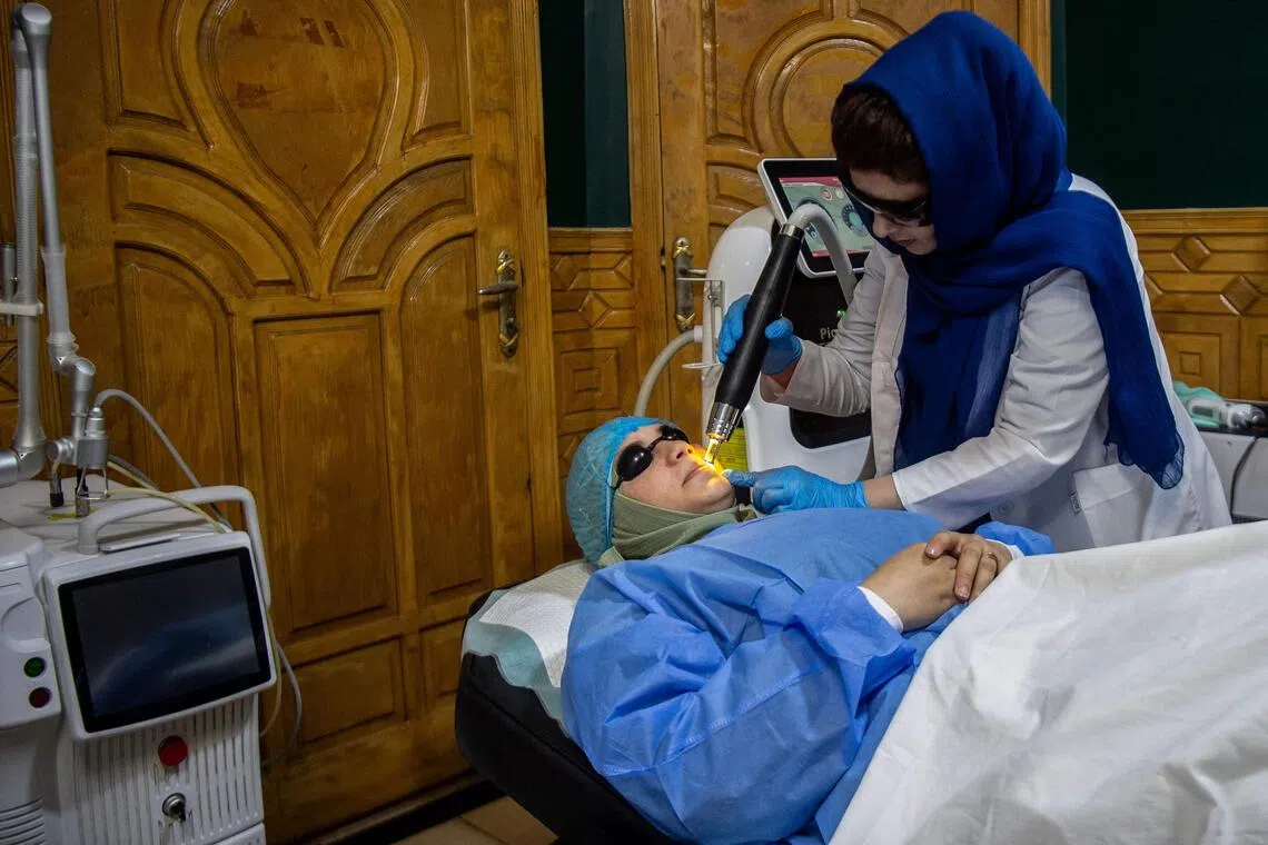 A medical staff member performing laser treatment on a patient at a beauty clinic in Kabul on Aug 31.