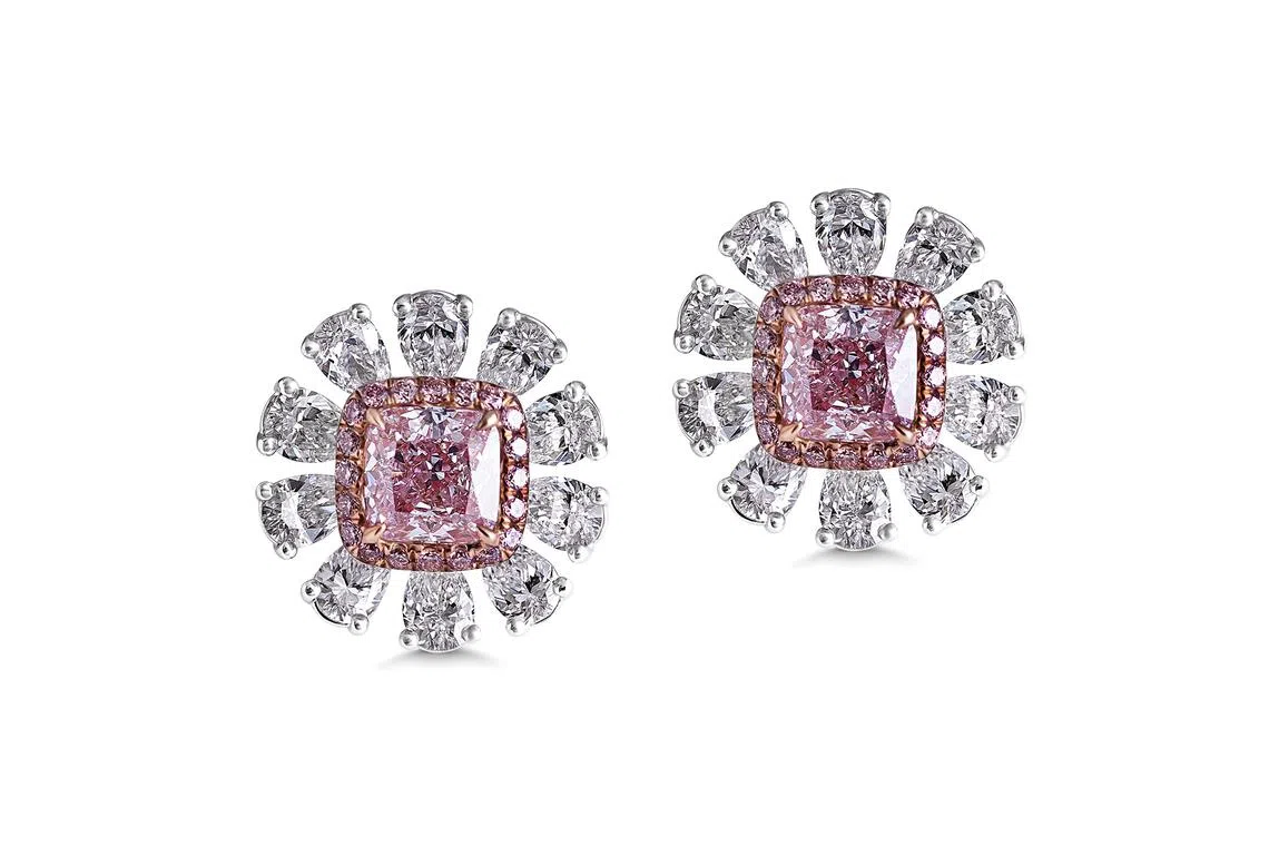 Featuring a pair of one-carat fancy light purplish-pink diamonds, the earrings are also set with pear-shaped white diamonds and round pink diamonds.