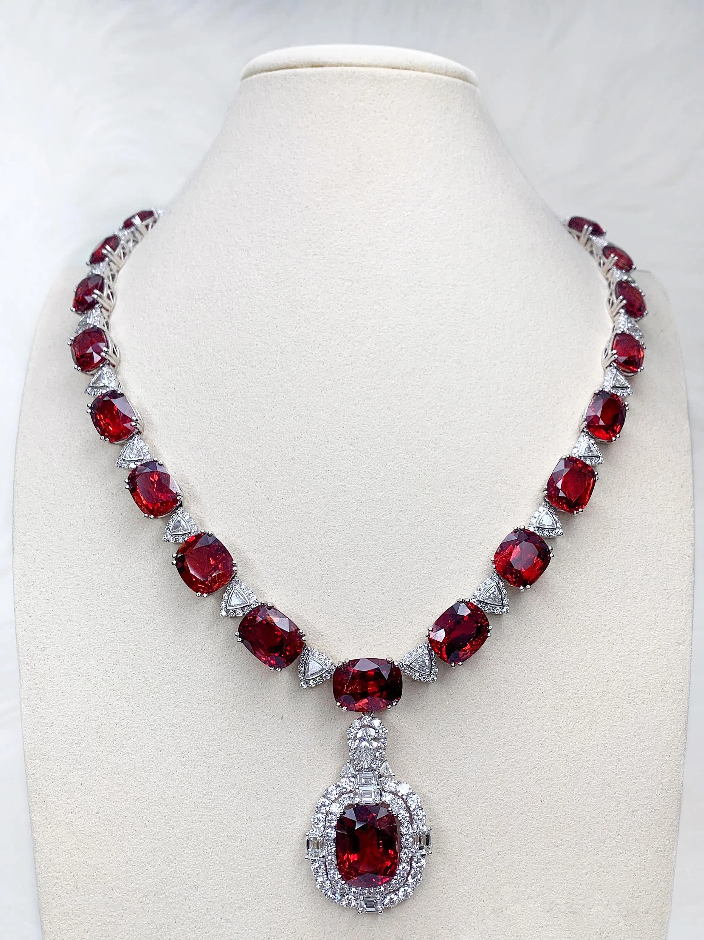 This necklace is made with 18 cushion-shaped, vivid red spinels amounting to 116.75 carats.