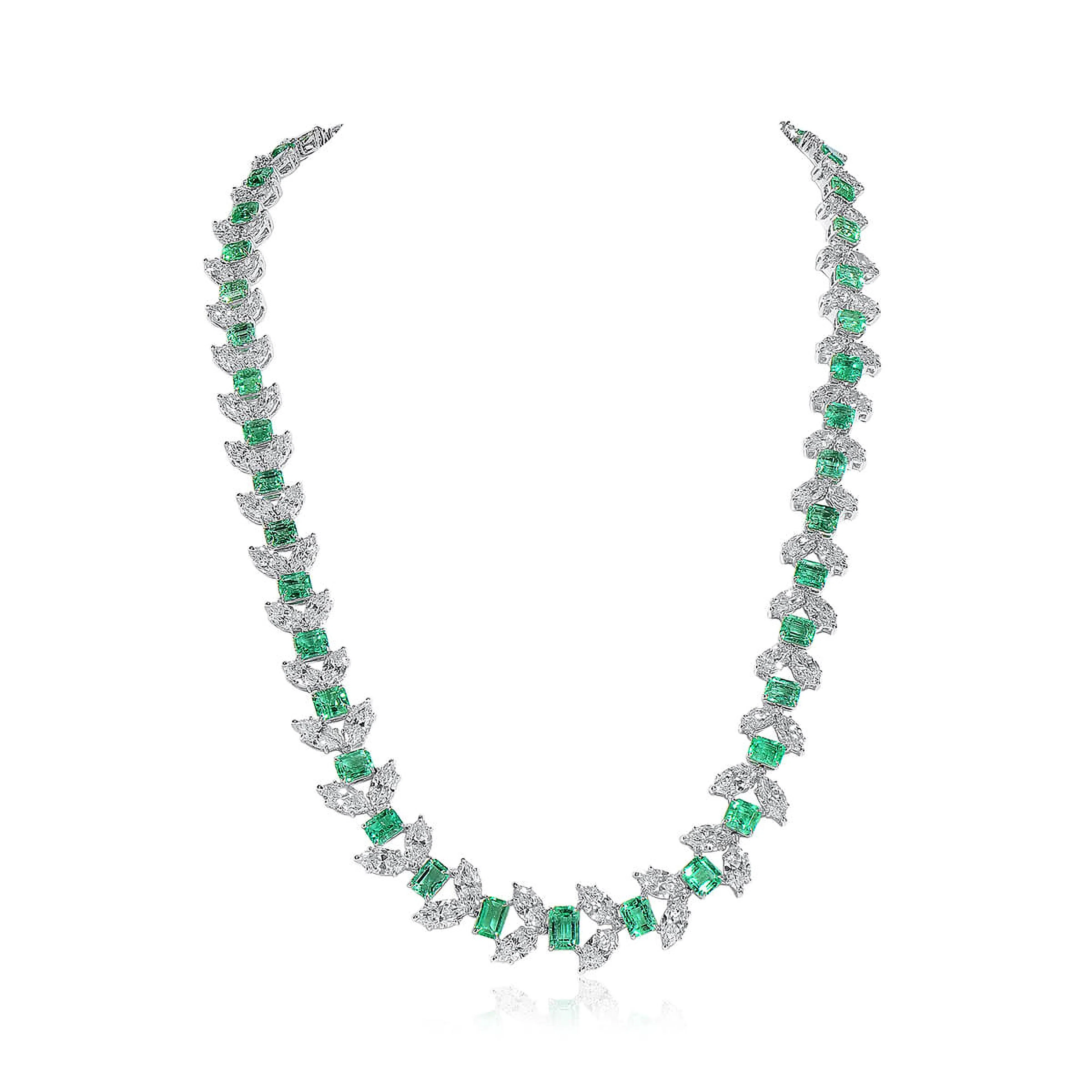 Showcasing a collection of 46 pristine octagonal Colombian emeralds and diamonds, this necklace dazzles with a combined carat weight of 46.72 carats.