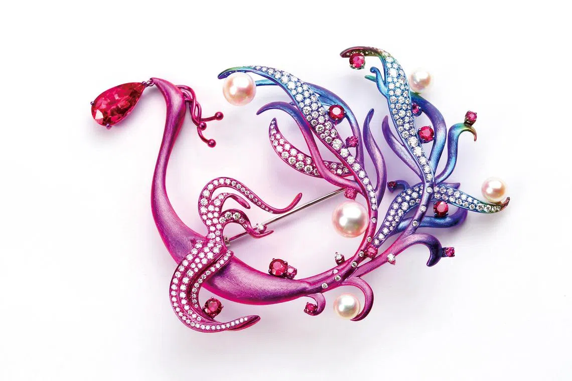 This brooch is set in titanium, spinels, pearls and diamonds.