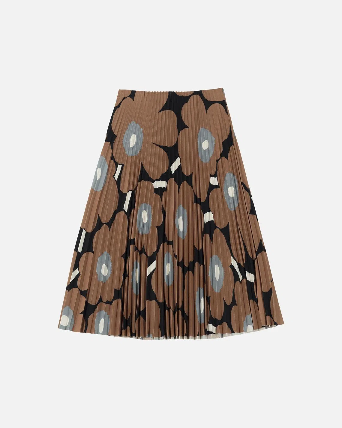 With its relaxed A-line fit and elastic waistband, the Myy plissee skirt is made from recycled polyester in the Unikko pattern designed by Finnish designer Maija Isola in 1964.