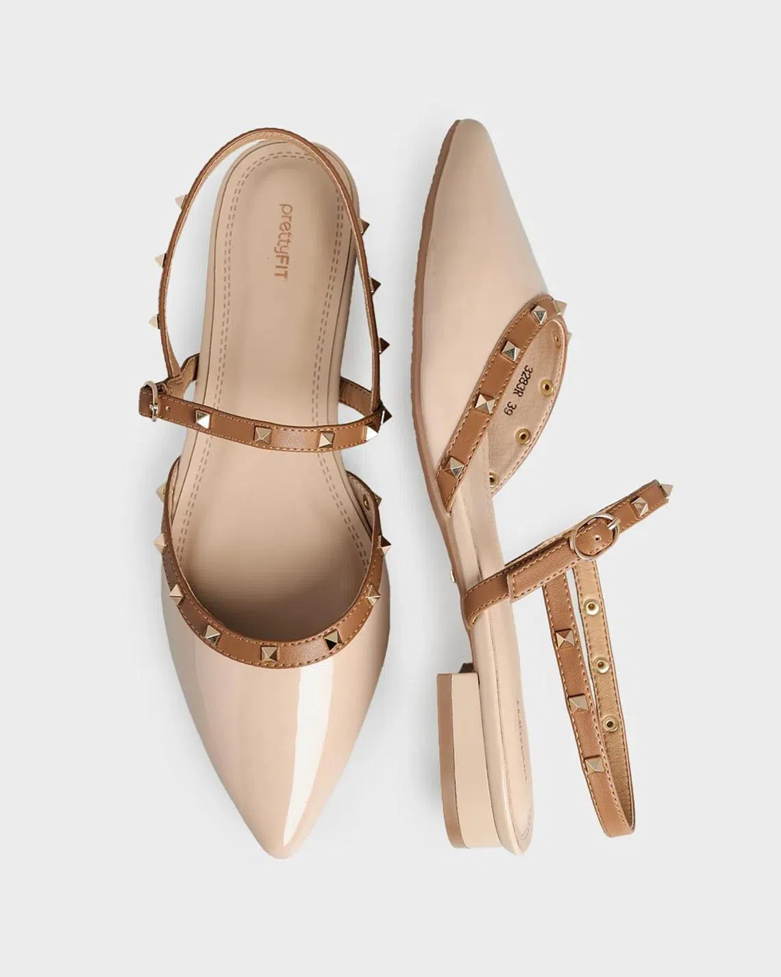 The Blakely flats offer a chic twist on a classic design, featuring glossy patent leatherette, gold studs and a low 2.5cm heel for all-day comfort.