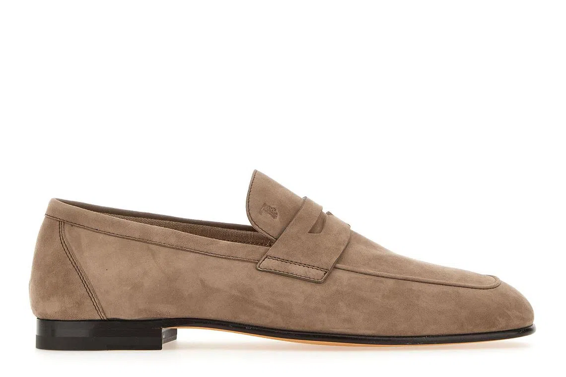 These suede loafers by Tod’s have a penny bar, leather outsole and stamped monogram, making them a versatile choice for both casual and formal styles.