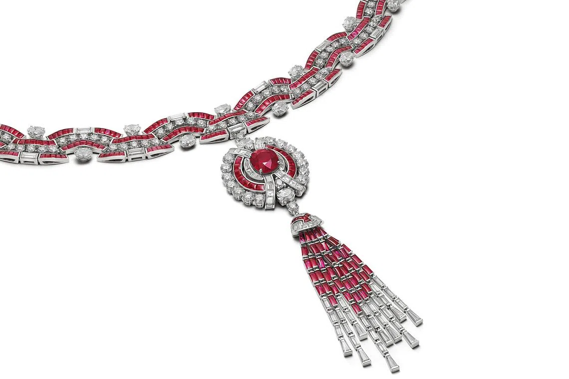 Made in platinum, the necklace is set with 18 oval diamonds, 87 rectangular-, trapezoidal- and fancy-shape diamonds, 96 round rubies, 345 buff-top rubies, and 97 round brilliant-cut diamonds and pave-set diamonds – all orbiting around a spectacular 10.02-carat antique cushion-cut Mozambique ruby. It took around 2,500 hours to complete.