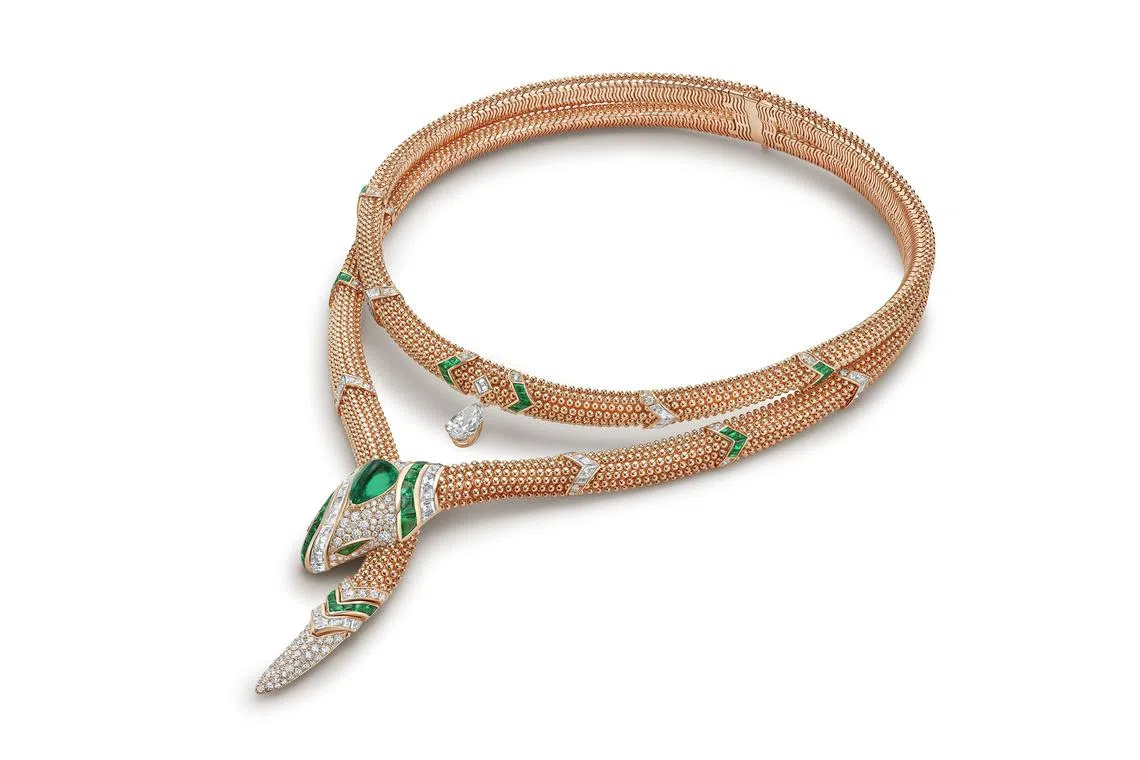 Bulgari’s Serpenti necklace in pink gold set with a 2.72-carat pear-shape emerald, diamonds and emeralds.