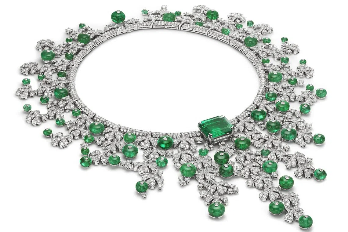 Likewise, each branch of diamonds and emerald beads cascades over the neck with grace. It is a masterpiece of movement and balance, made up of tiny diamond-set leaves (totalling 71.24 carats) and 62 emerald beads (totalling 130.77 carats).